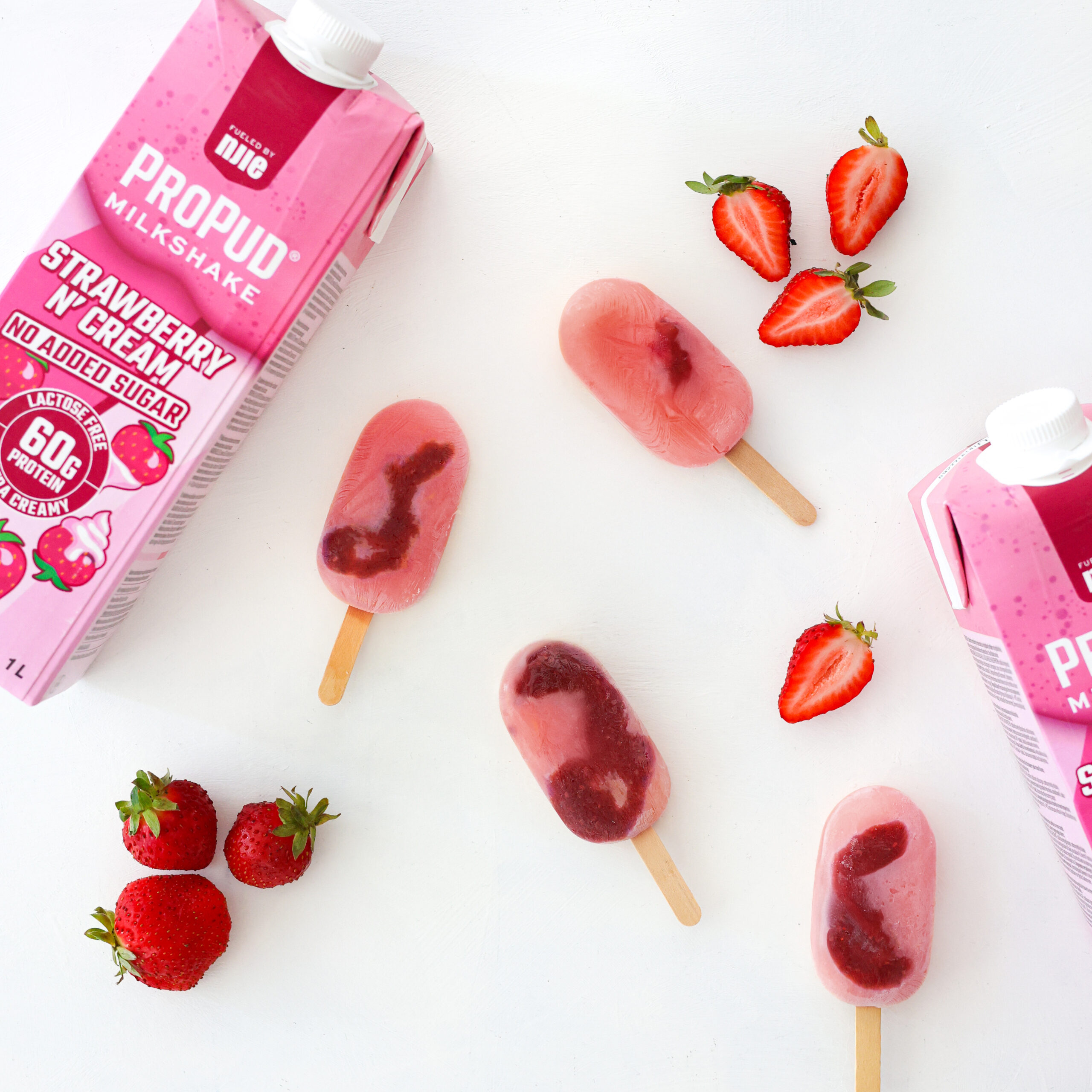 Boil the frozen strawberries on low heat for 30 min. Let cool. Put some of the strawberry jam in an ice cream mold, and fill with ProPud Strawberry N' Icecream. Freeze overnight, and enjoy a healthy and protein-rich strawberry ice cream!